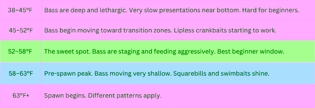 Water temperature is your most important data point during this period. Here’s a simple breakdown of what bass are doing at different temperature ranges: