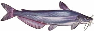 Identifying features: Forked tail, spotted sides (especially on younger fish), 8 barbels (whiskers) around the mouth, deeply forked tail fin. Blue-gray to olive-brown coloration.