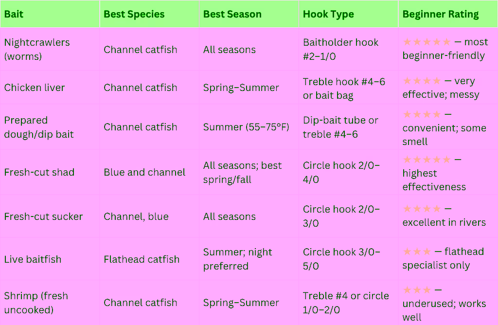 Start with worms, then experiment: Nightcrawlers are the most universally effective beginner catfish bait across all seasons and all water types. They’re available at every bait shop and most gas stations near fishable water. They work on channel catfish everywhere. Thread 2-3 large nightcrawlers onto a 2/0 circle hook, leaving tail ends to wave in the water, and you have a functional catfish rig anywhere in the country.
