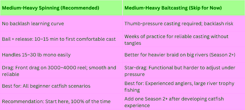 The correct starting point is a medium-heavy spinning combo in the 7-foot range, paired with a 3000-4000 size spinning reel with a front drag system. This handles channel catfish in ponds through blue cats in rivers, casts the 1-3 oz sinkers catfishing requires, and gives you enough line capacity to handle a longer run from a larger fish. The Shakespeare Ugly Stik Camo Spinning Combo in the 7 ft medium-heavy configuration ($35-$55) is the most widely available, reliably functional beginner catfish combo on the market and the specific recommendation for most first-time catfish anglers.